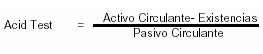 El 'Acid Test'nos muestra una imagen más precisa de la liquidez de la empresa ya que elimina del activo circulante la partida de Existencias que generalmente es la parte menos líquida y más difícilmente realizable en dinero. El valor medio de este ratio es de 0,8 lo que supone que por cada 100 euros de deudas a corto plazo, la empresa dispone de 80 en la tesorería o en activos realizables en tesorería a corto plazo para hacerles frente (vg.clientes).
