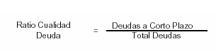 El ratio de Calidad de la Deuda, nos muestra cuales son los compromisos a corto plazo que la empresa tiene respecto al total de deudas. Este ratio está muy relacionado con el ratio de Gasto Financiero ya que generalmente una estructura de deuda basada en el corto plazo (Pólizas de Crédito) , implica que las cargas financieras sean más elevadas. Por lo tanto, el valor de éste será mejor cuanto más bajas sean las deudas a corto plazo.