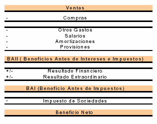 Para elaborar los ratios, aparte del Balance de Situación necesitaremos también la Cuenta de Resultados (o Cuenta de Pérdidas y Ganancias), es decir, la diferencia entre los ingresos y los gastos de la empresa y el beneficio que obtenemos. Este es un ejemplo de cuenta de resultados: